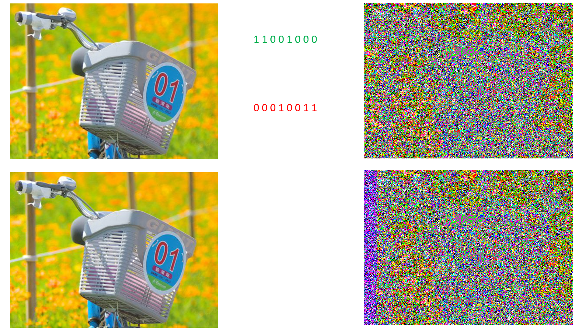 According to Wikipedia, Steganalysis is the study of detecting messages hidden using steganography; this is analogous to cryptanalysis applied to cryptography. We will learn a simple technique of steganalysis. I do not know if it has a name but this is the idea behind it. Let consider our bike image. Here is a component of a pixel in the image $\overline{11001000}^2$. We just reverse this component to get a new component $\overline{00010011}^2$ .