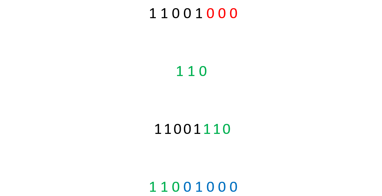 Here is how we can encode a message in our image. Let consider a component of a pixel which is $\overline{11001000}^2$. The least significant bits are considered here $000$. The message is $110$. In general the message can be anything that can be represented in bits. Here it will be the most significant bit of the image we want to hide. We just replace the least significant bits by our message in original component. We then get $\overline{11001110}^2$. This is the encoded image. Decoding after is just straightforward. Get the message bits and add some random bits behind.