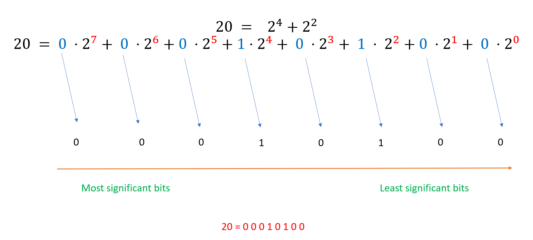 With that in mind we can use a steganography technique called Least Significant Bits(LSB) to hide a message in our image. How would it be possible? We said that a pixel is a triplet. When we consider one dimension the values are between $0$ and $255$. So in total there are $256$ possibilities, which is also equivalent to $2^8$ possibilities. In computer language the values can be encoded in $8$ bits.Here is an example with $20$.