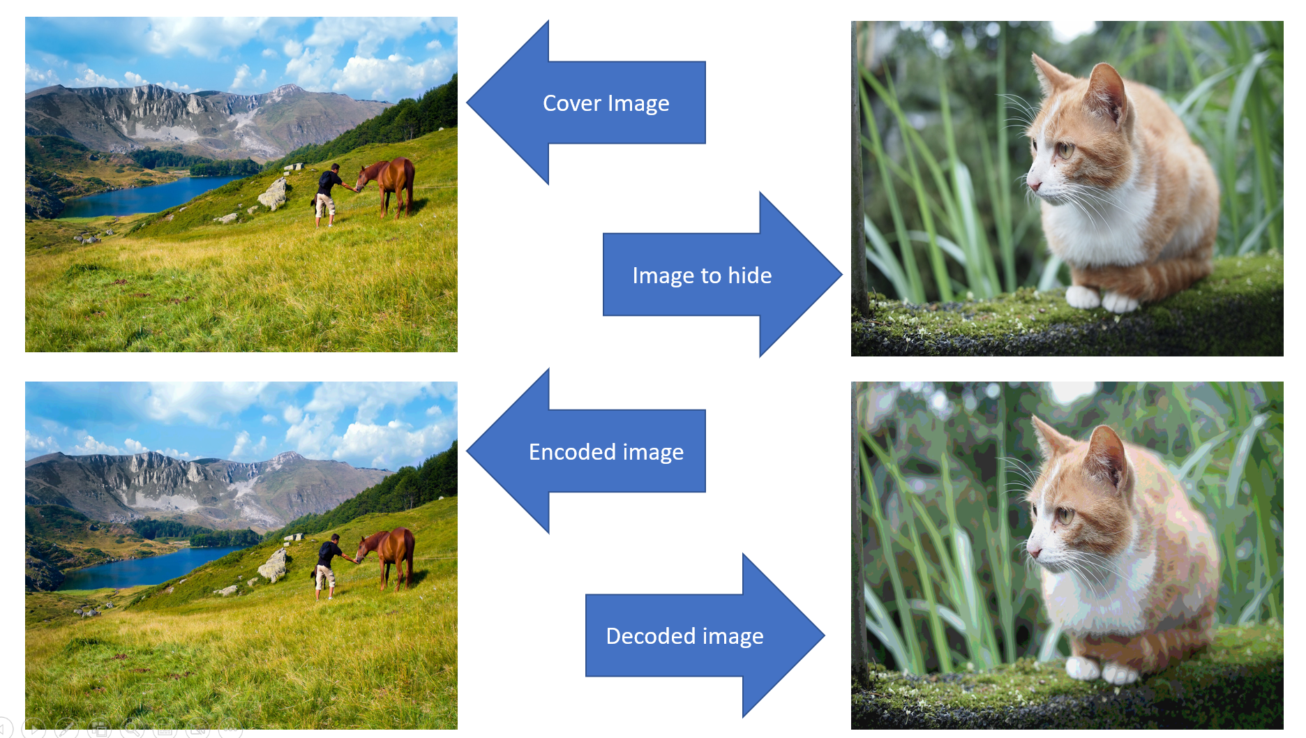 Here is another example with our cover image, the image to hide, the encoded image and the decoded image. The decoded image does not have the same quality as the original one, but we still have something visible and it is enough for what we want to do. We now know how to hide an image into another one.